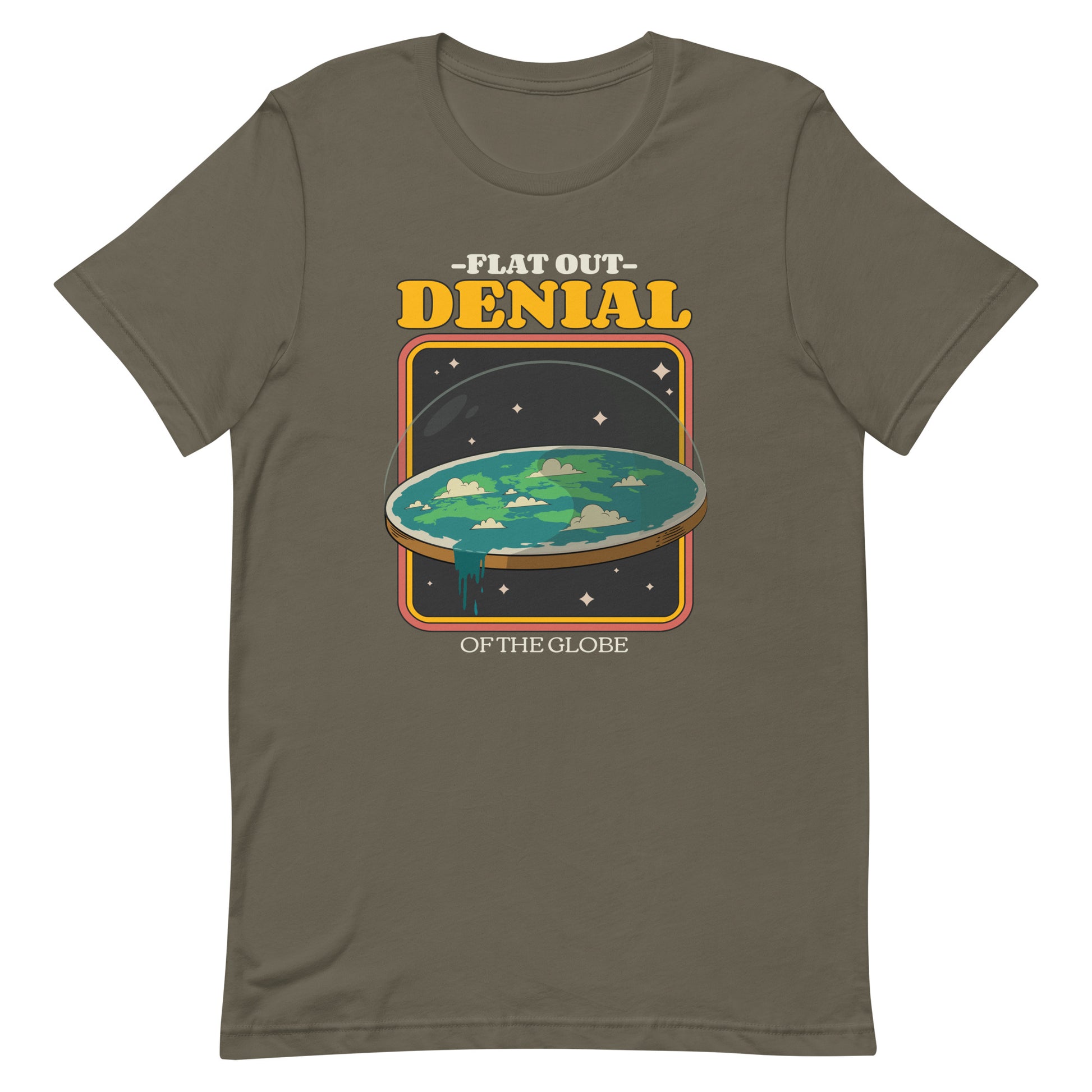 Cosmic Comedy: "Flat Out Denial of the Globe" design playfully embraces the humor of a flat Earth theory, featuring a whimsical illustration of Earth as a flat disc. It's perfect for those who appreciate light-hearted and quirky humor.