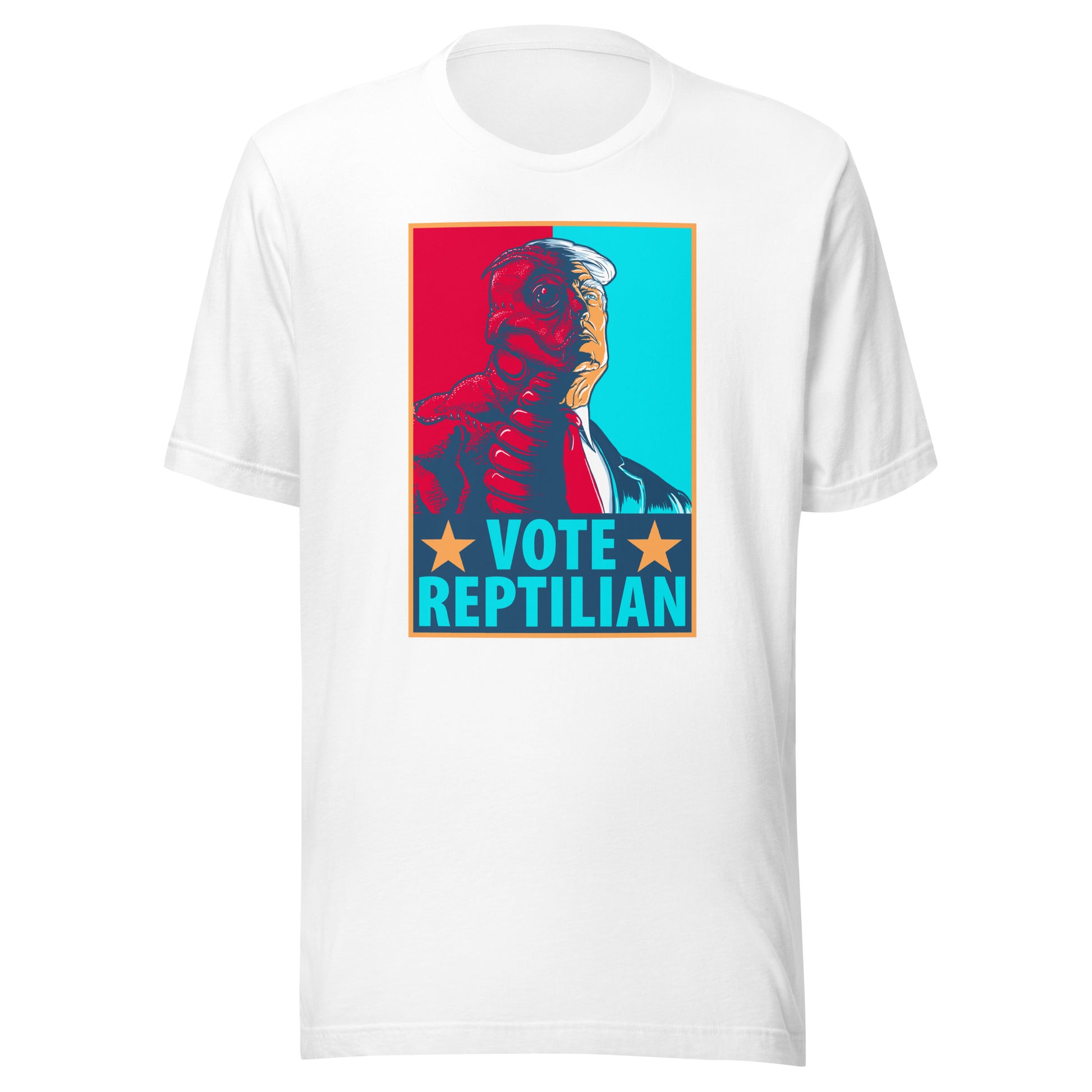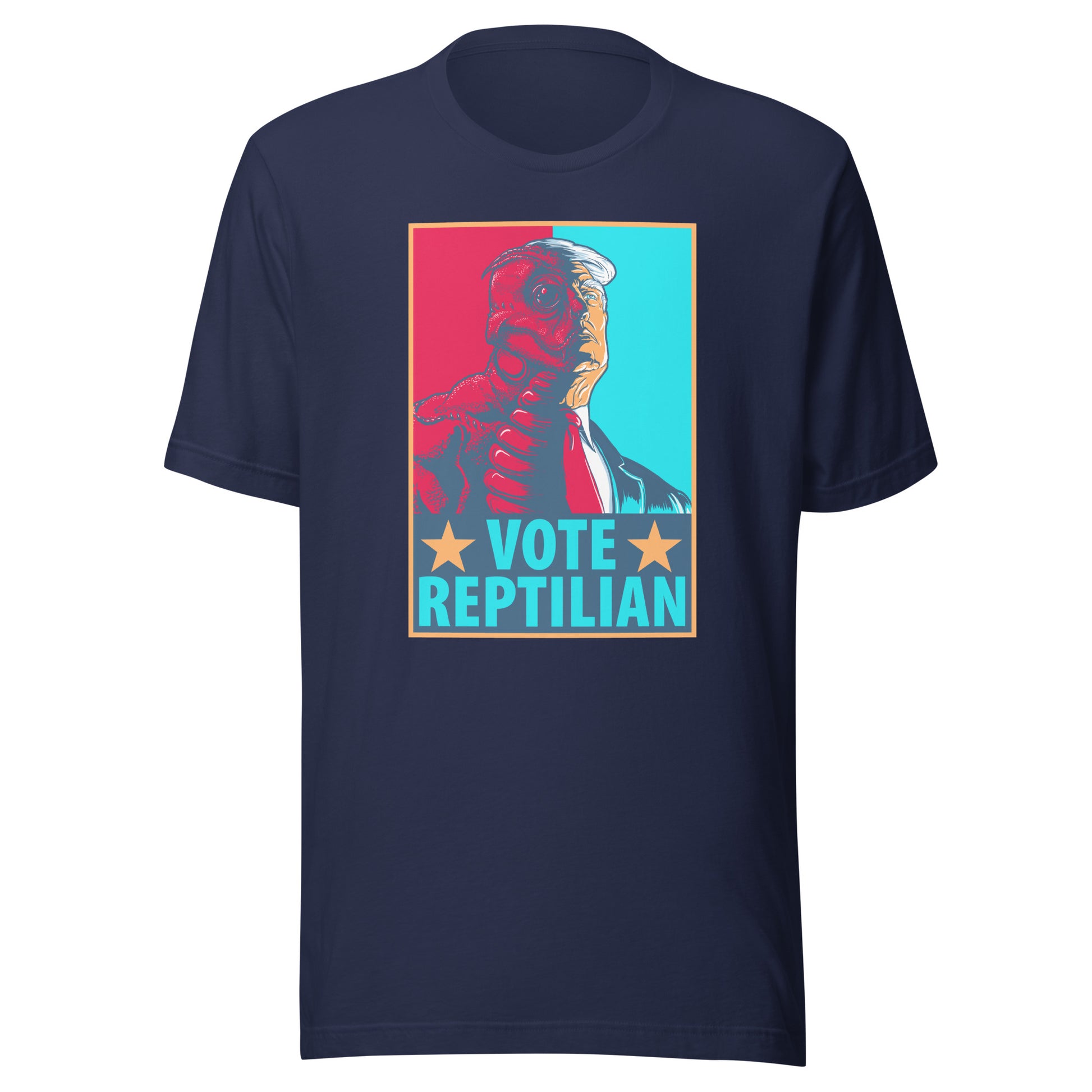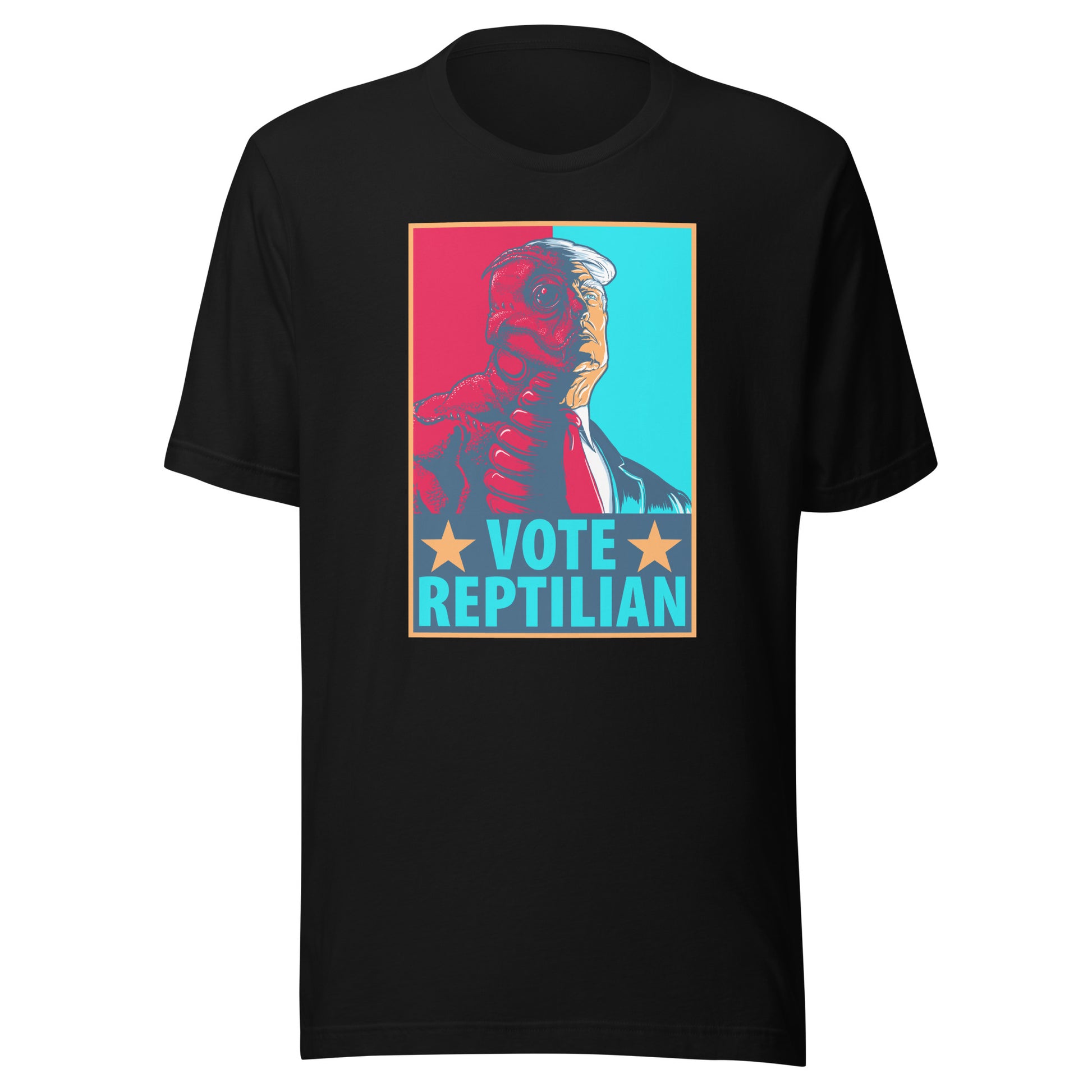 Vote Reptillain design is inspired by Shepard Fairey Obama Hope Poster. Kyle La Fever inserted a Lizard Person to the red side of the display as a reference to the conspiracy thoery that lizard people secretly run the government. This is a playful shirt designed to tease political theories.